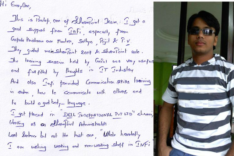 Pratap and his team was mentored by Gopal and Maha on technology, personality and communications. He worked very hard to build the skills required at InFI with the help of mentors, and succeeded in getting career break as Sharepoint administrator.
